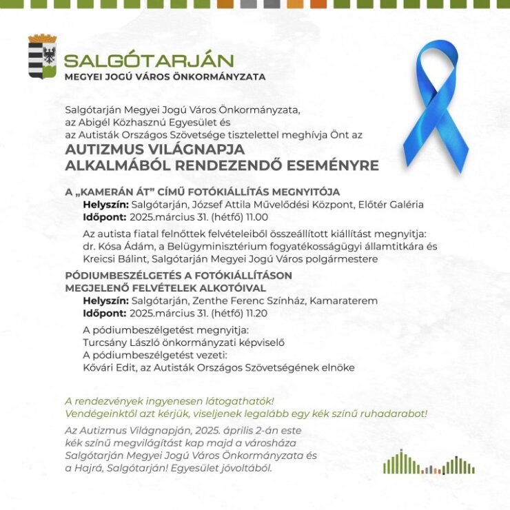 Salgótarján Megyei Jogú Város Önkormányzata, az Abigél Közhasznú Egyesület és az AOSZ közös szervezésében az Autizmus Világnapja alkalmából fotókiállítás nyílik Salgótarjánban 2025. március 31-én.